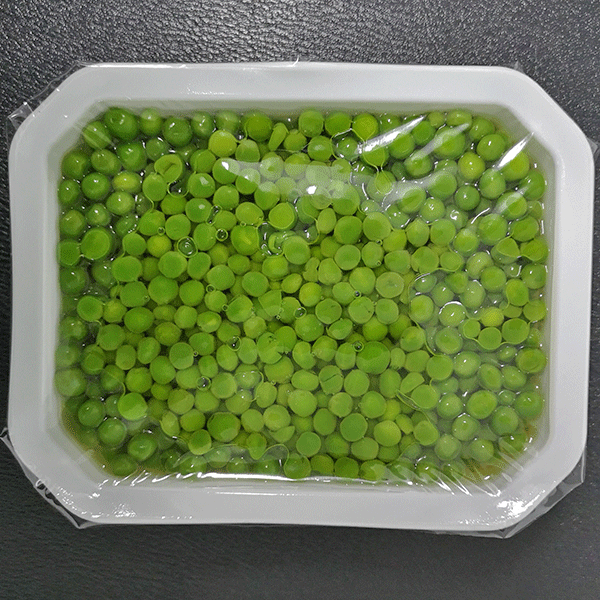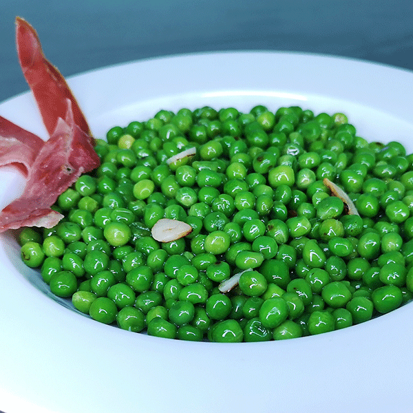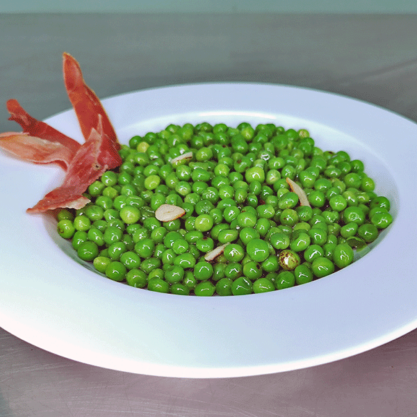 Guisantes casi lágrima confitados. Con una textura suave y crujiente.